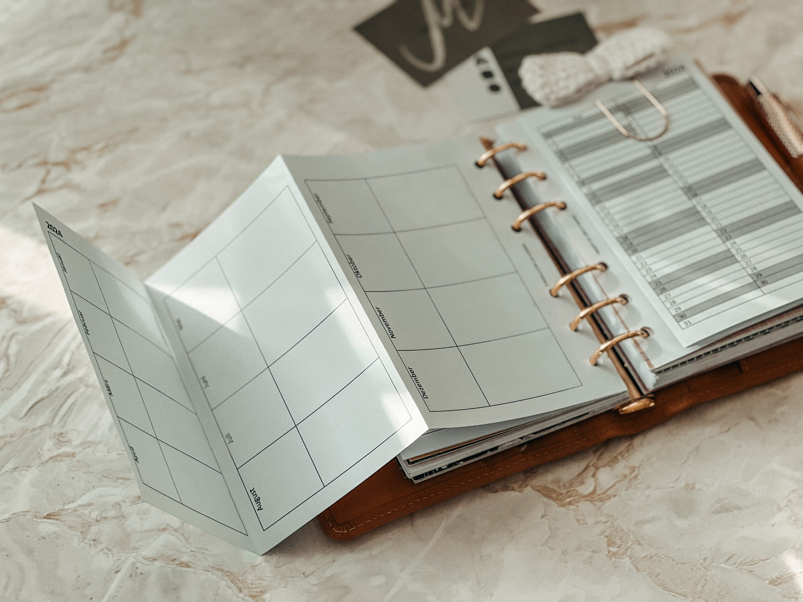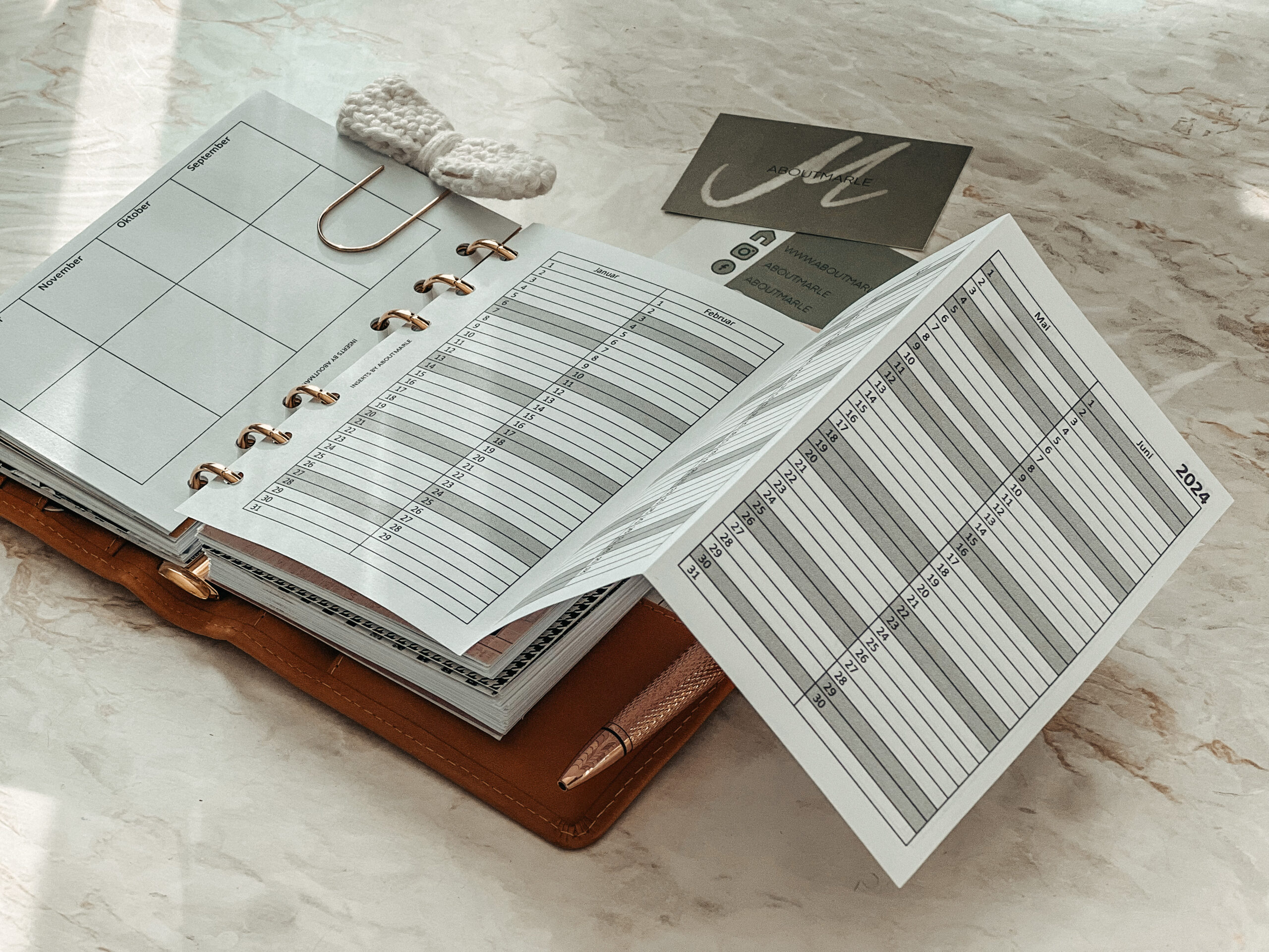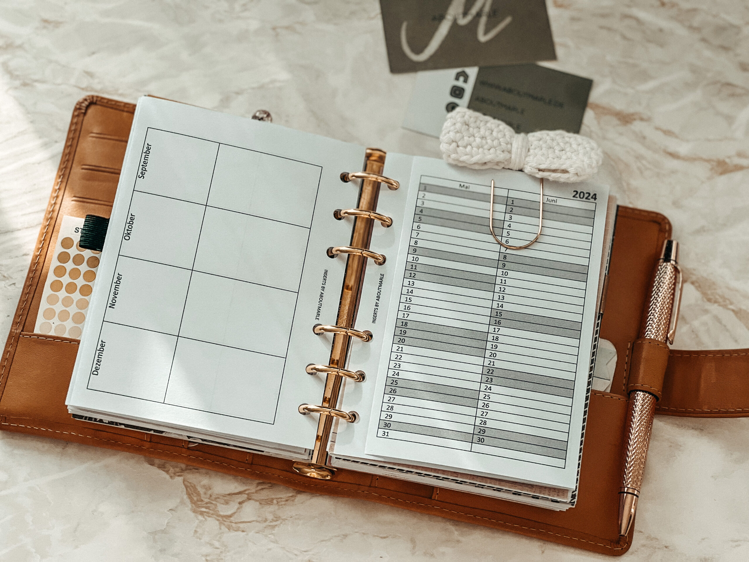 Wenn du gerne wichtige Ereignisse langfristig planen möchtest ist dieses Insertkit genau das richtige für dich! Du hast für zwei Jahre je eine Ansicht auf einer Seite und Platz für Notizen auf der Rückseite, hier kannst du schnell nachschauen auf welchen Wochentag das Datum fällt oder mit dem Textmarker deinen Urlaub markieren. Eine aufklappbare Jahresübersicht pro Jahr ermöglicht es dir Geburtstage und wichtige Ereignisse zu notieren. Bei der anderen aufklappbare Jahresübersicht hast du eine Auflistung der einzelnen Monate, pro Seite ist ein Jahr abgebildet, hier kannst du zum Beispiel notieren an was du denken musst. Wir notieren uns hier zum Beispiel die Kündigung vom Handyvertrag, damit wir die Kündigungsfrist nicht verpassen.