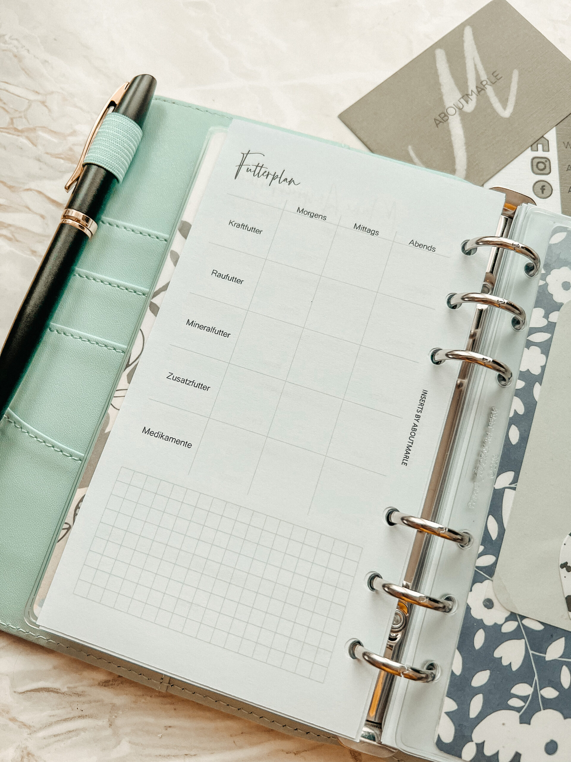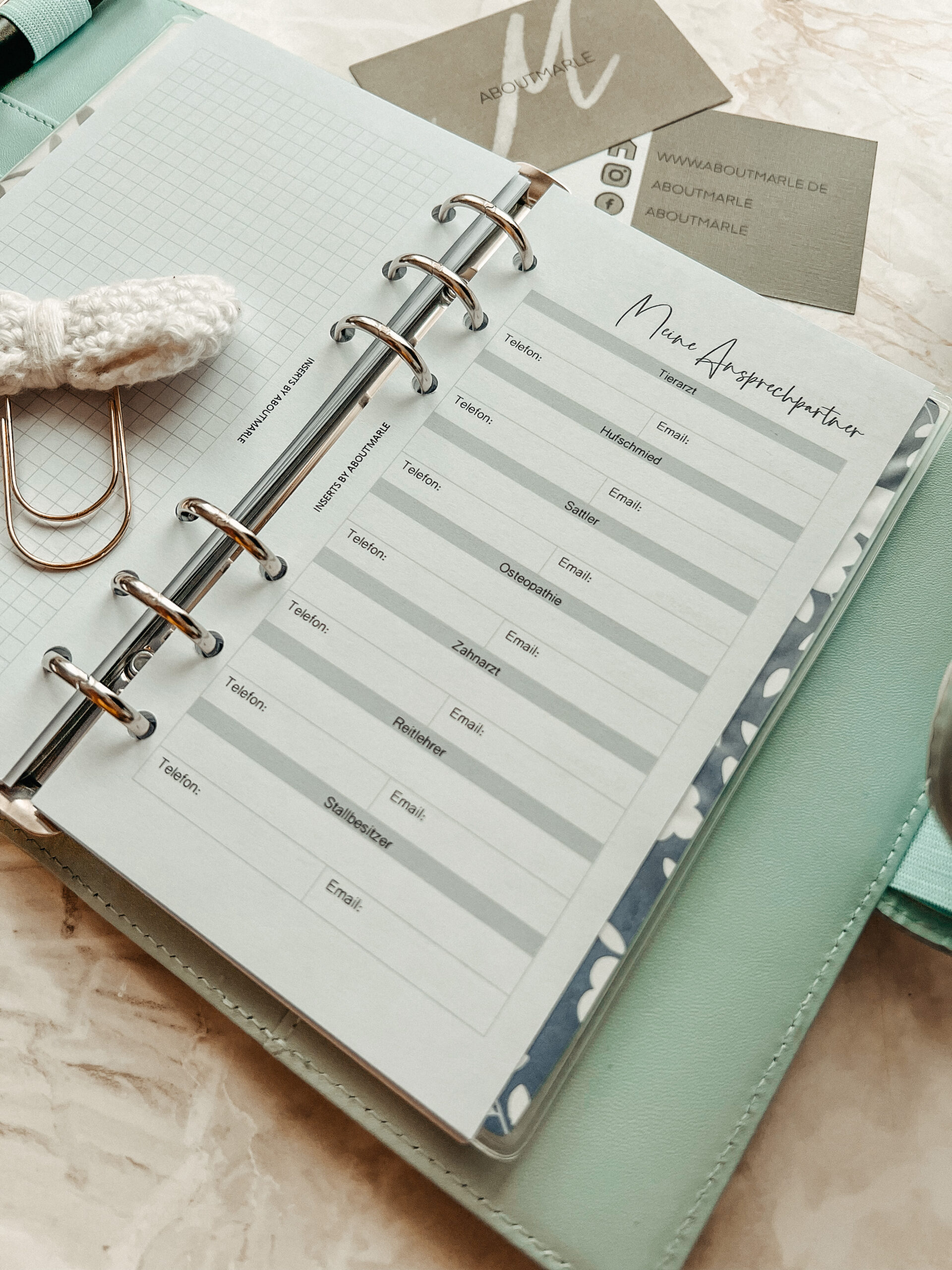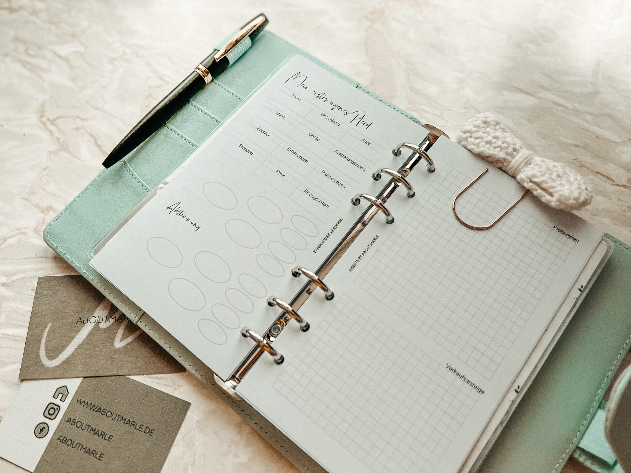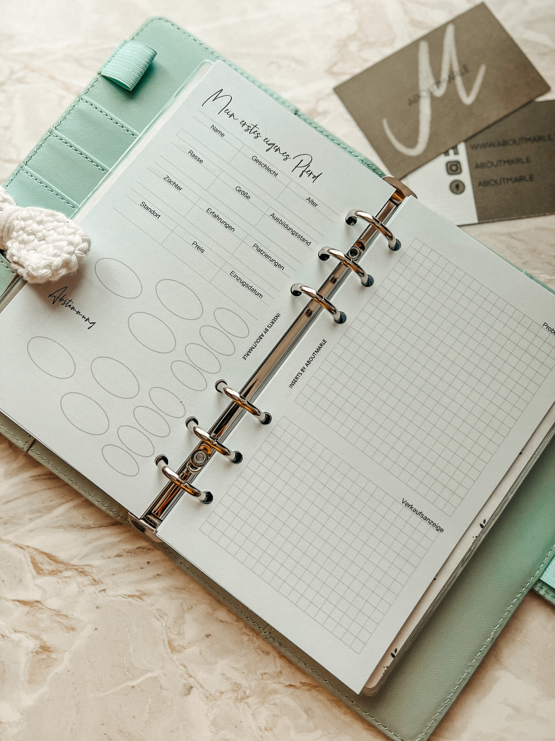 Weiter geht es mit diesem Insert. Dieses ist ausgelegt für 12 Monate und du kannst damit jederzeit beginnen, da es undatiert ist. Du trägst einfach in den Monatsübersichten den Monat und in den Kästchen das jeweilige Datum ein. Hier kannst du eintragen was ihr gemacht habt und wann der nächste Tierarzt oder Hufschmiedtermin ist. Durch die Ringmechanik vom Bindern kannst du Problemlos ein weiteres Jahr hinzufügen. Außerdem kannst du hier dein Trainings- und Fütterungsplan, deine Ansprechpartner, deine monatlichen Fixen und Variablen Ausgaben notieren sowie deine Turniererfolge und deine Wünsche.