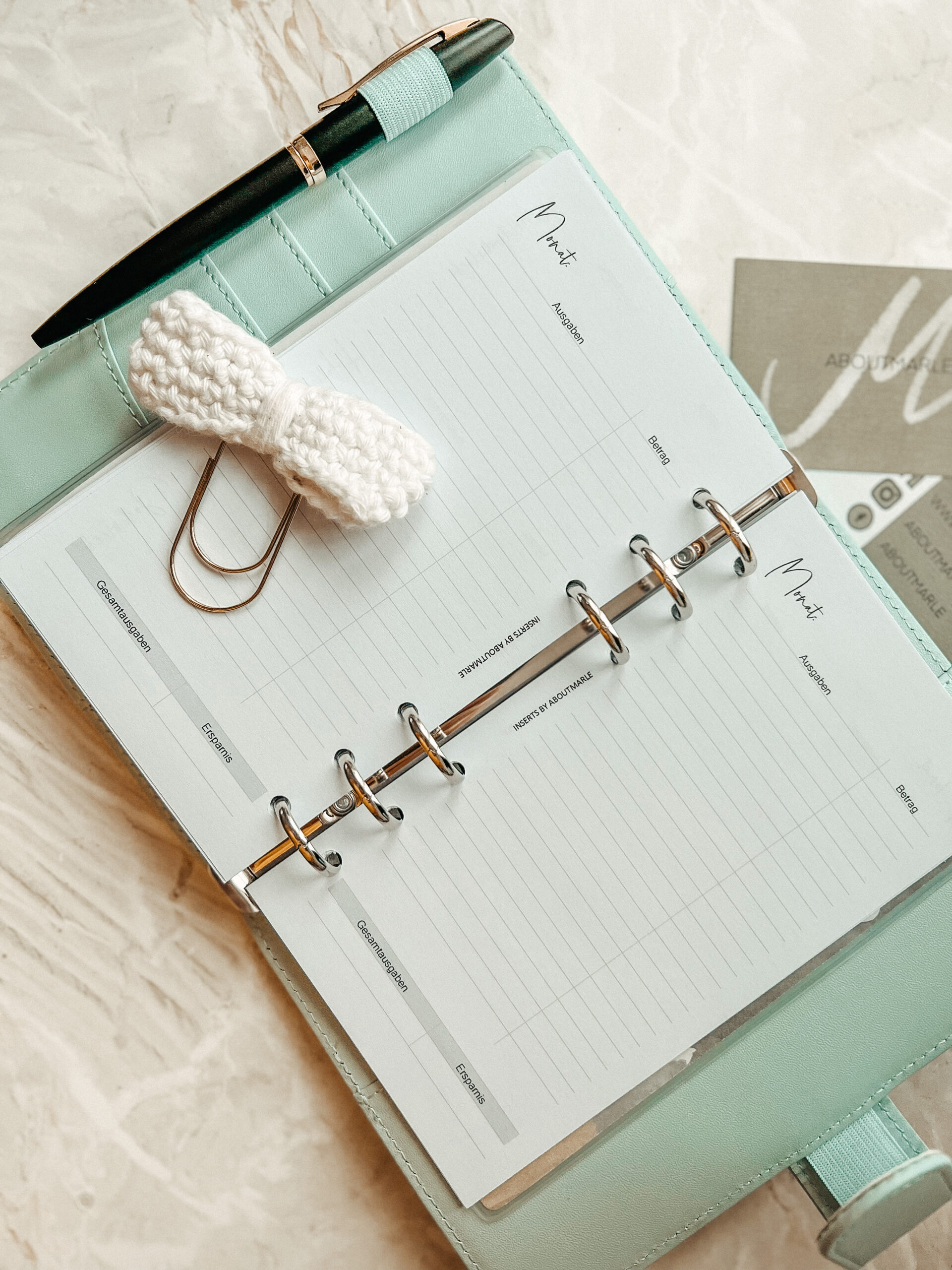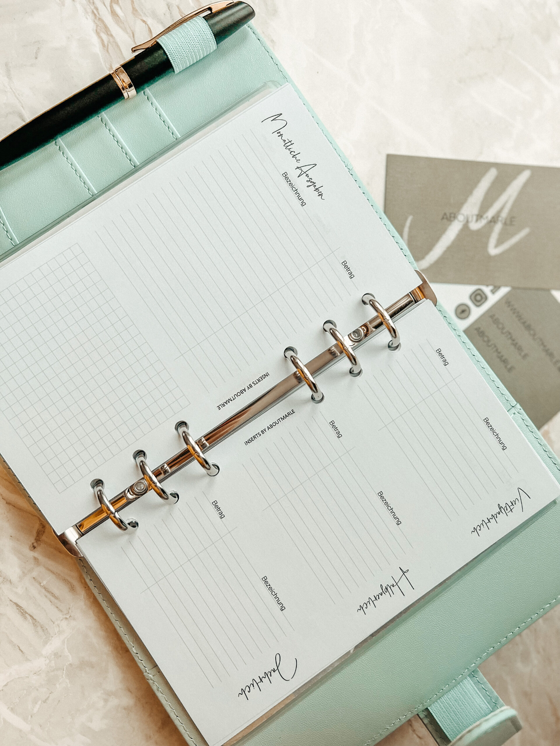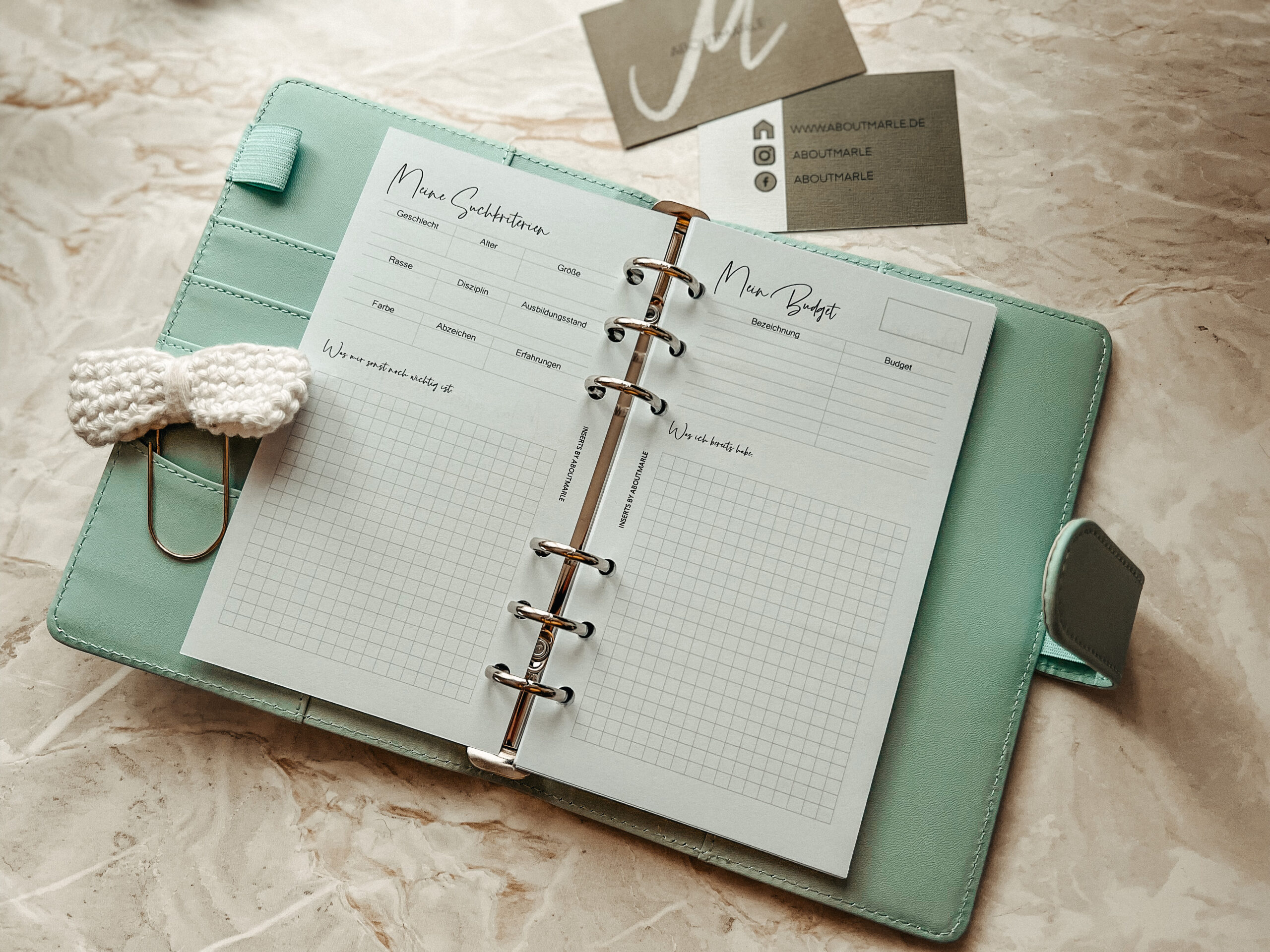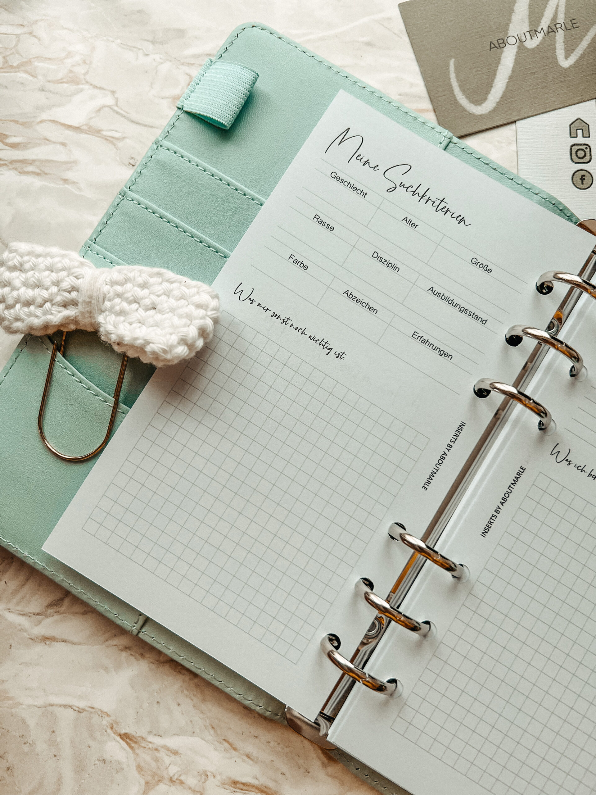 Weiter geht es mit diesem Insert. Dieses ist ausgelegt für 12 Monate und du kannst damit jederzeit beginnen, da es undatiert ist. Du trägst einfach in den Monatsübersichten den Monat und in den Kästchen das jeweilige Datum ein. Hier kannst du eintragen was ihr gemacht habt und wann der nächste Tierarzt oder Hufschmiedtermin ist. Durch die Ringmechanik vom Bindern kannst du Problemlos ein weiteres Jahr hinzufügen. Außerdem kannst du hier dein Trainings- und Fütterungsplan, deine Ansprechpartner, deine monatlichen Fixen und Variablen Ausgaben notieren sowie deine Turniererfolge und deine Wünsche.